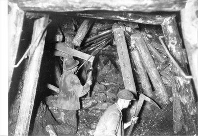 Mit weichen Knien leuchteten sie die Strecke ab, um das ganze Ausmaß des unvorstellbaren Gebirgsdruckes zu erkennen. Fast 20 m der Strecke, wie man kurze Zeit später feststellte, waren zusammengedrückt. Von den ca. 4 m² Querschnitt war noch 1 m2 vorhanden, aber nur auf einer Länge von 4 – 5 Metern, dann war die ganze Strecke verschüttet. Der hölzerne Ausbau war gebrochen, zersplittert, die dicken Stempel aus Fichtenholz wie Streichhölzer geknickt. Gott sei Dank waren sie weit genug von dem Streckenbruch weg und hatten außer einigen Schrammen, wo sie der Luftdruck zu Boden geworfen hatte, keine Verletzungen. Die Männer atmeten tief durch und warteten auf den Steiger, der über einen Blindschacht zu ihnen heruntergeklettert kam. Er sah sich den Schaden an und traf die notwendigen Anweisungen. Da es einer von den umgänglichen Steigern war, packte er auch selbst mit an, um den noch unversehrten Ausbau, direkt an der Einbruchstelle zu verstärken. Kurze Zeit später kamen weitere Bergleute von den anderen Abbaustellen und begannen mit den Aufräumungsarbeiten. Loses Gestein, zerbrochene Holzknüppel, gespreißelte Bretter wurden aus dem Streckenteil gezogen und zugleich der verschobene Ausbau durch Hilfsstempel abgestützt.