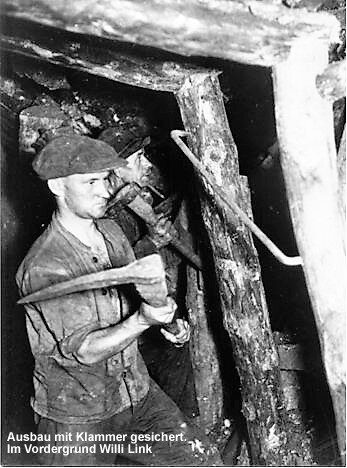 Eines Tages, so um 1948, war eine Gruppe auf der 104 m Sohle der Grube Caroline beim Rückbau. Das ist so zu verstehen: Vom Schacht aus wurden die Hauptförderstrecke (hier fuhr die Grubenbahn) und von da aus die einzelnen Abbaustrecken aufgefahren (gegraben) und zwar immer - soweit möglich- innerhalb des Erzkörpers. D. h., das Erz über und neben den Strecken blieb zunächst stehen und wurde nicht abgebaut. Die Strecken wurden durch den Ausbau mit Holz gegen den Druck des darüber liegenden Gesteins gesichert. Je nach dem Druck des Gebirges wurde der Ausbau enger oder weiter gemacht. Die Ständer und Firste standen bei hohem Gebirgsdruck dichter nebeneinander, als sonst üblich. Wenn das Ende des Erzkörpers erreicht war, wurde zurückgebaut. Jetzt wurde auch das über und neben der Strecke vorhandene Erz herausgeholt.