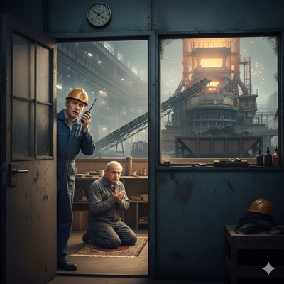 Also schickte Konrad den Vorarbeiter Ludwig los: „Schau bitte mal nach Mehmet, nicht dass ihm was passiert ist.“ Ludwig stapfte los, suchte den ganzen Bereich ab, schaute beim Bagger, beim Förderband, hinter jeder Ecke – kein Mehmet. Gerade als er sich fragte, ob Mehmet vielleicht verdampft sei, öffnete er die Tür zum Brotzeitraum. Und da war er.